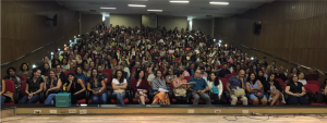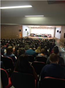 We zitten op het podium in het auditorium van de Medische universiteit van Goiânia, Brazilië.